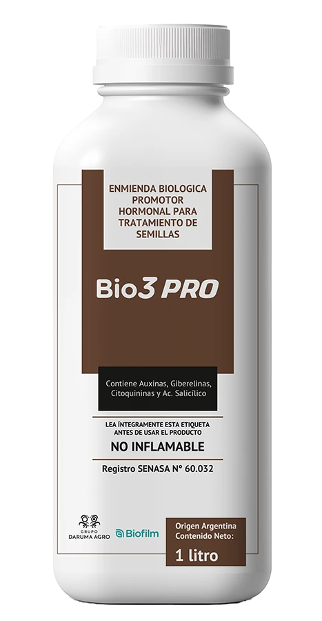 BIO3 PRO es un promotor hormonal de crecimiento para el tratamiento de semillas formulado con un balance de auxinas, giberelinas, citoquininas y ácido salicílico, que actúa directamente sobre las etapas iniciales del cultivo. Su acción potencia los cultivos, optimizando la implantación y la absorción de nutrientes; además, mejora la resistencia a enfermedades y favorece un crecimiento más vigoroso, logrando así un rendimiento superior.
