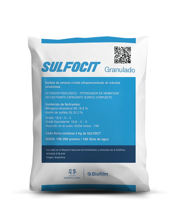 SULFOCIT es un sulfato de amonio cristal, formulado con la tecnología CIT advanced. En aplicaciones fitosanitarias actúa como activador fisiológico, potenciando la performance de determinados principios activos de herbicidas. Esta tecnología acelera el efecto quemado y el porcentaje de control de las malezas gracias a que mantiene al nitrógeno en forma amoniacal. Dentro de sus atributos, esta tecnología se destaca por su excelente solubilidad, evitando así cualquier tipo de problemas en las mezclas, y por su baja dosis de uso, haciendo más eficiente el almacenamiento y la logística.